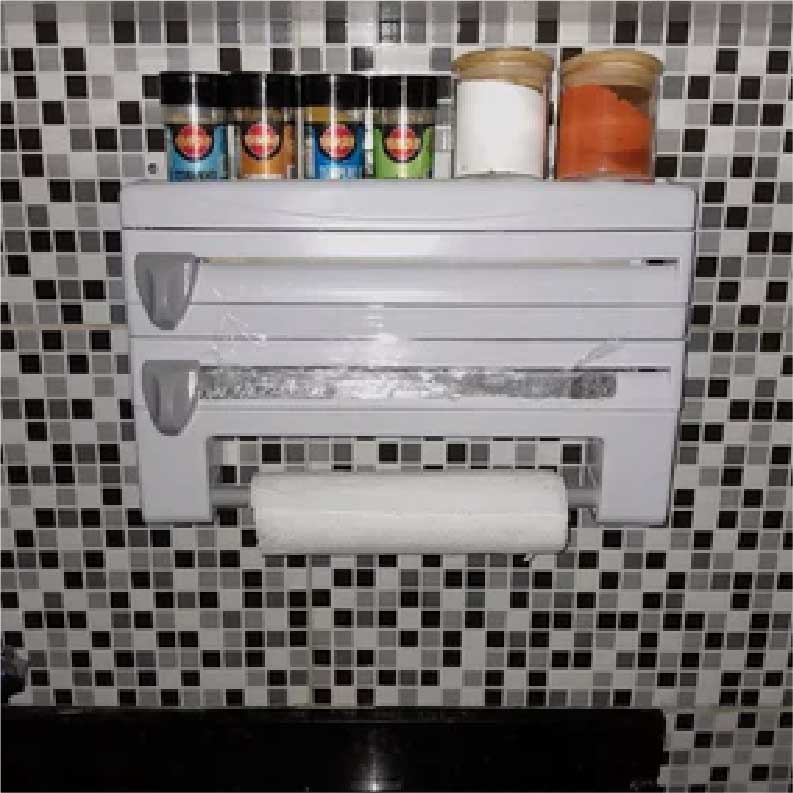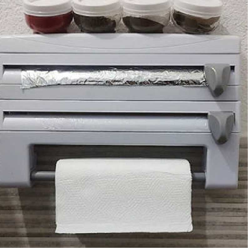 Organiza tus rollos de papel de cocina, papel aluminio y film transparente en un solo dispensador práctico y elegante.