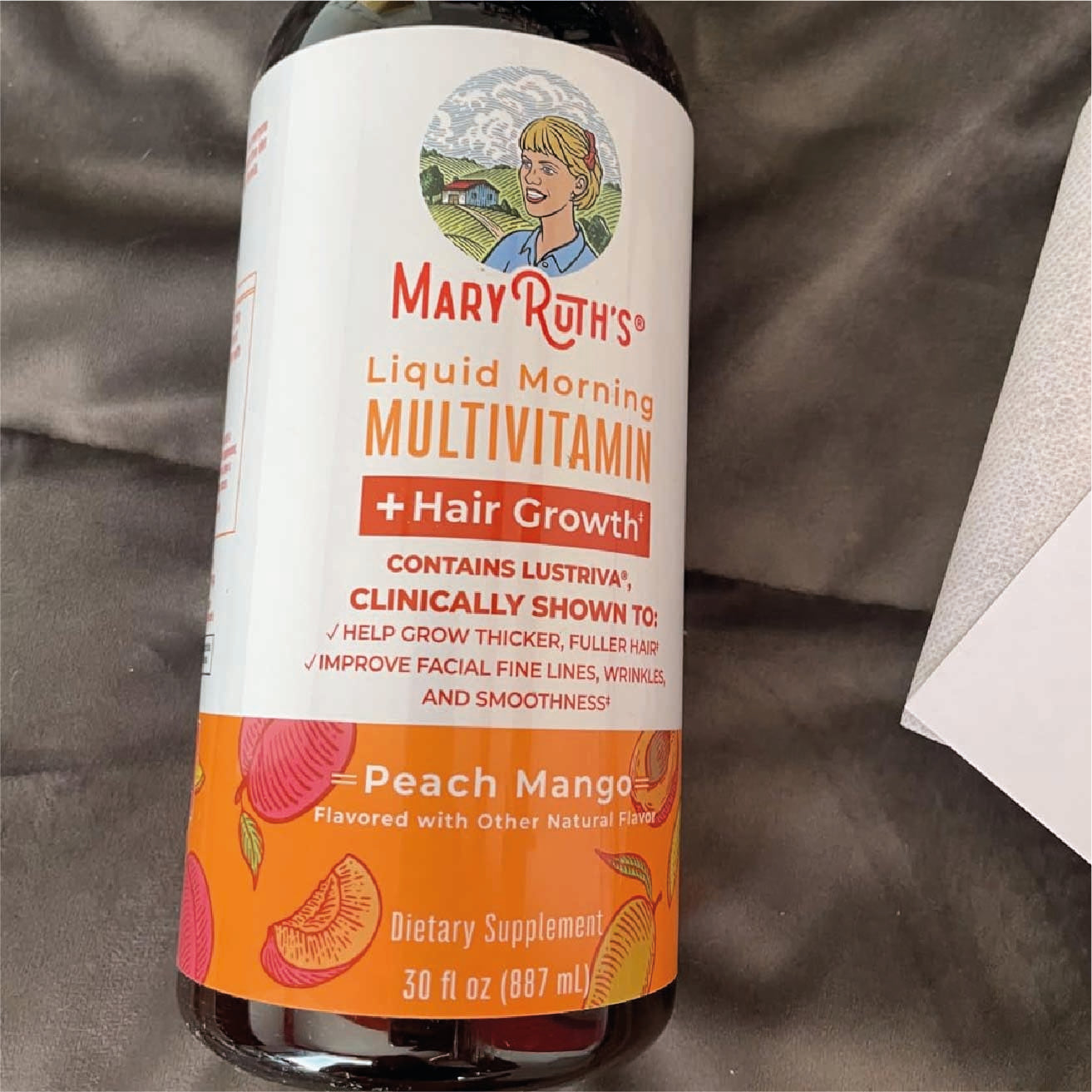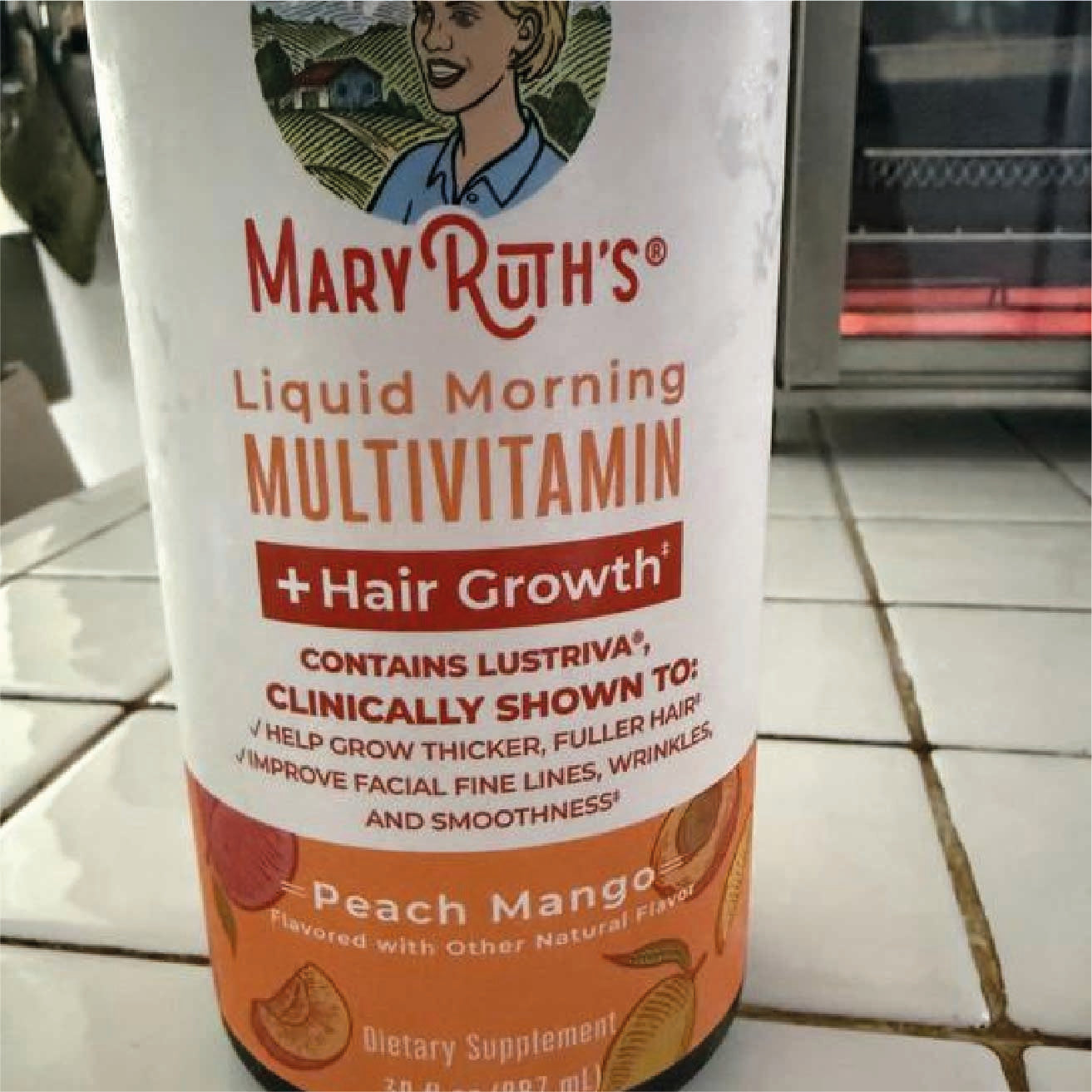 Es líquido, con sabor mango–melocotón.